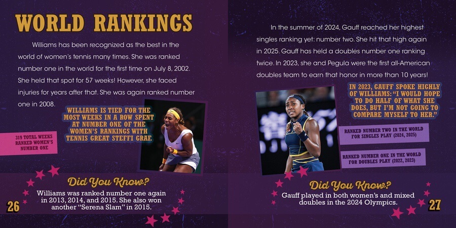 Serena Williams dominated women's tennis for more than 20 years. She won 23 Grand Slam singles titles as well as made her mark in doubles. Coco Gauff is still young and can't boast the same numbers—but is rising to the top of the tennis world. Can a rising star and a retired player be compared to decide who's the greatest? Readers have a chance to do just that in this dynamic book. Stats, stories, and biography of each player is included alongside full-color photographs of Williams and Gauff in action.