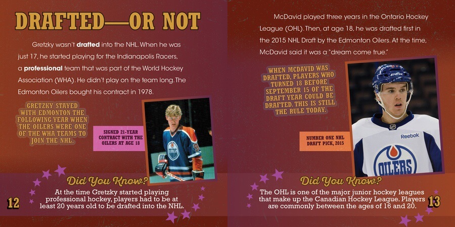 When Wayne Gretzky retired, Connor McDavid was only about two years old. Can players from such different eras of the sport be compared? Readers of this thrilling volume are going to try! The book presents the biography of legend Gretzky and modern superstar McDavid through stats, records, and championship appearances. Full-color photographs showcase the best hockey action of both men's careers while fact boxes add even more information, which builds readers knowledge, a key component of the science of reading.